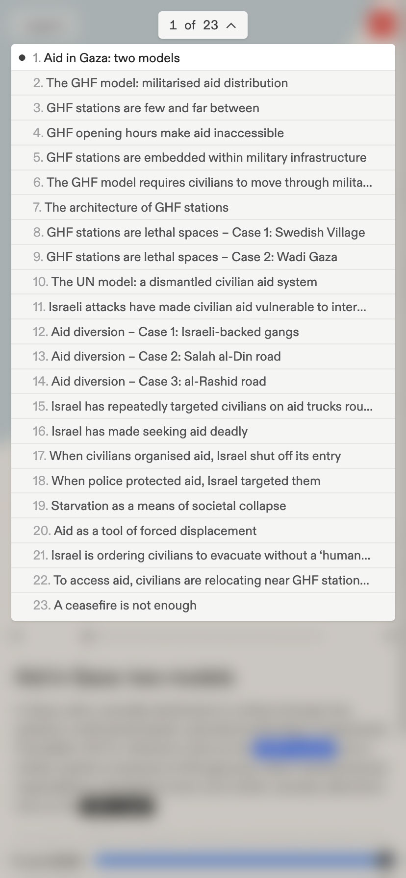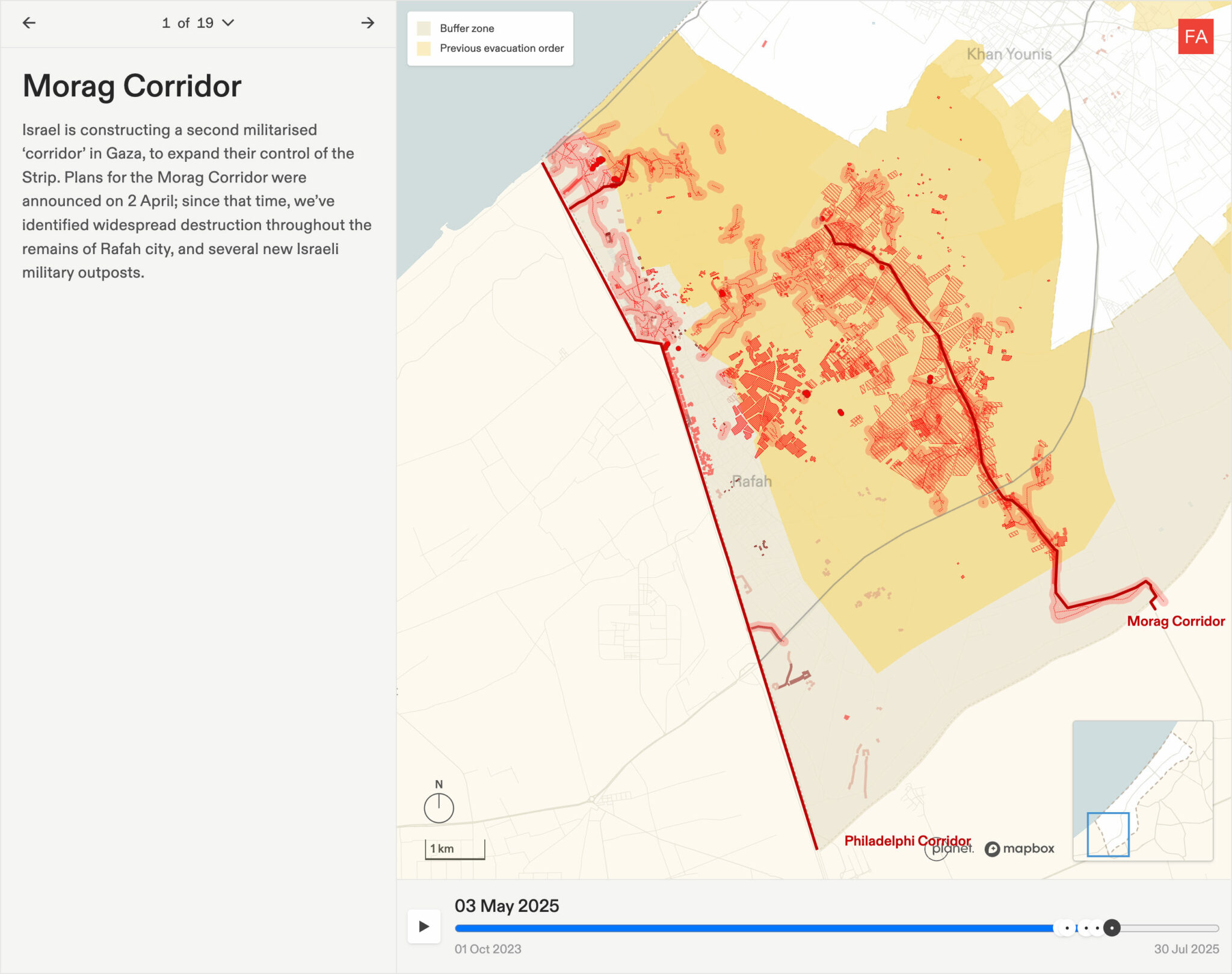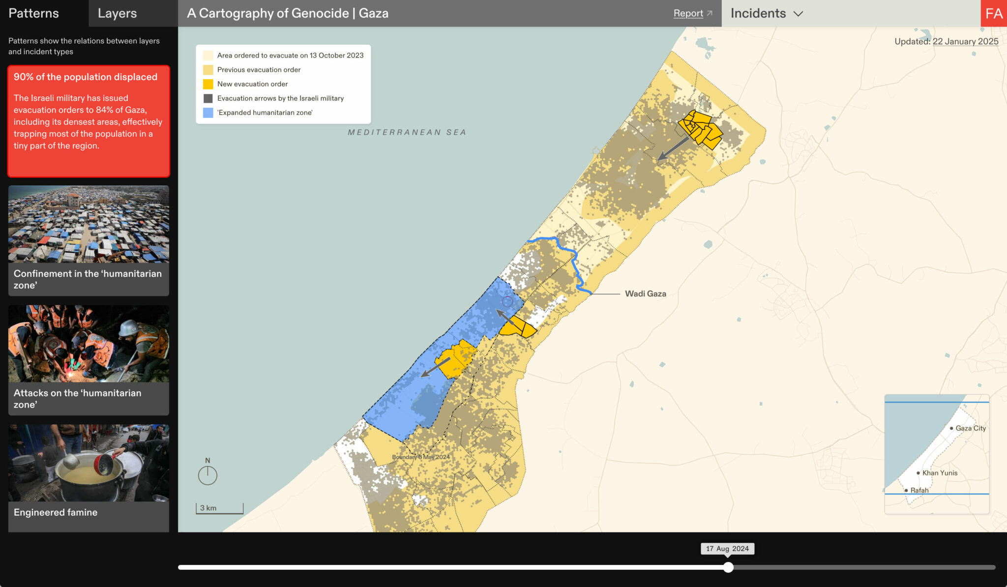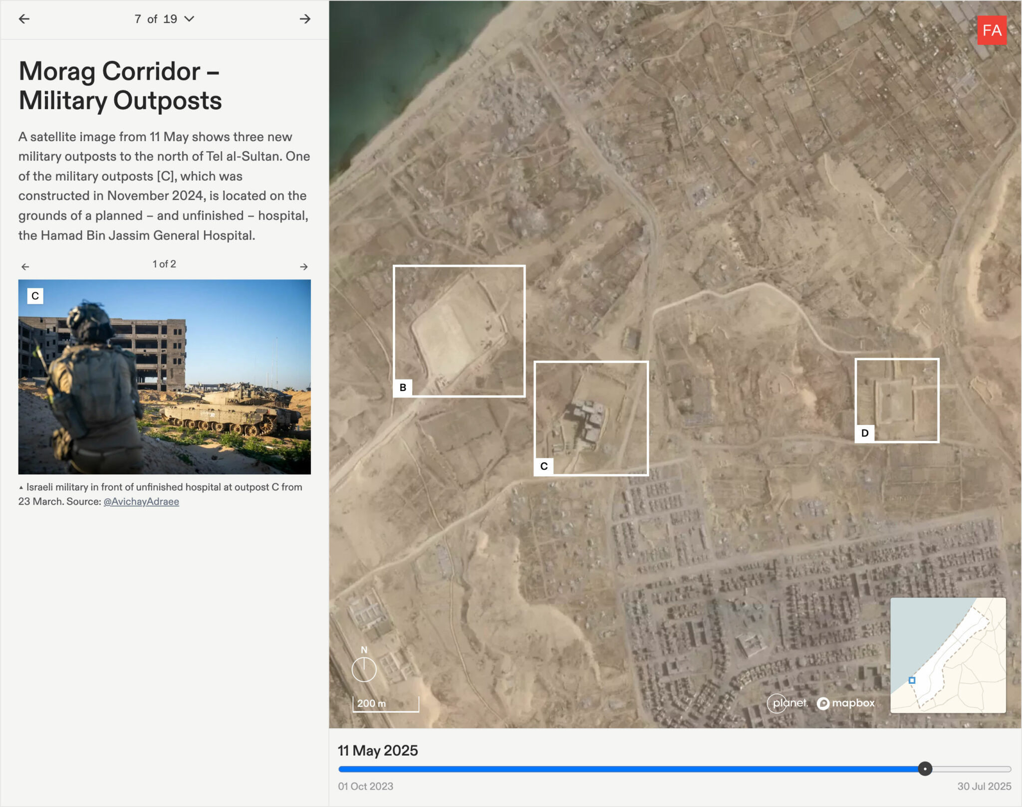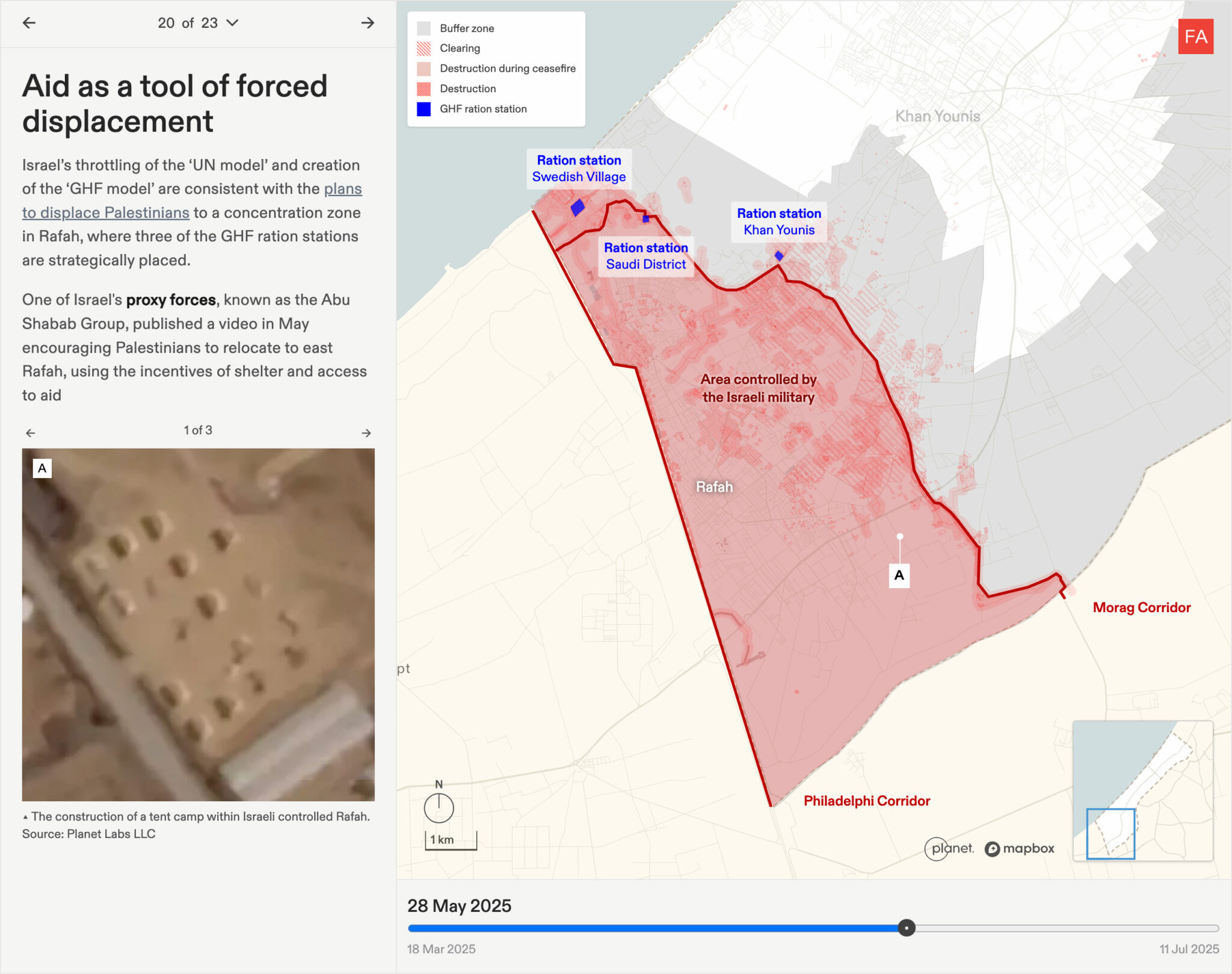 An ongoing collaboration with Forensic Architecture that began in summer 2024. Together we’ve developed tools for geospatial annotation, creating and capturing images for reports, and authoring narrative research threads.