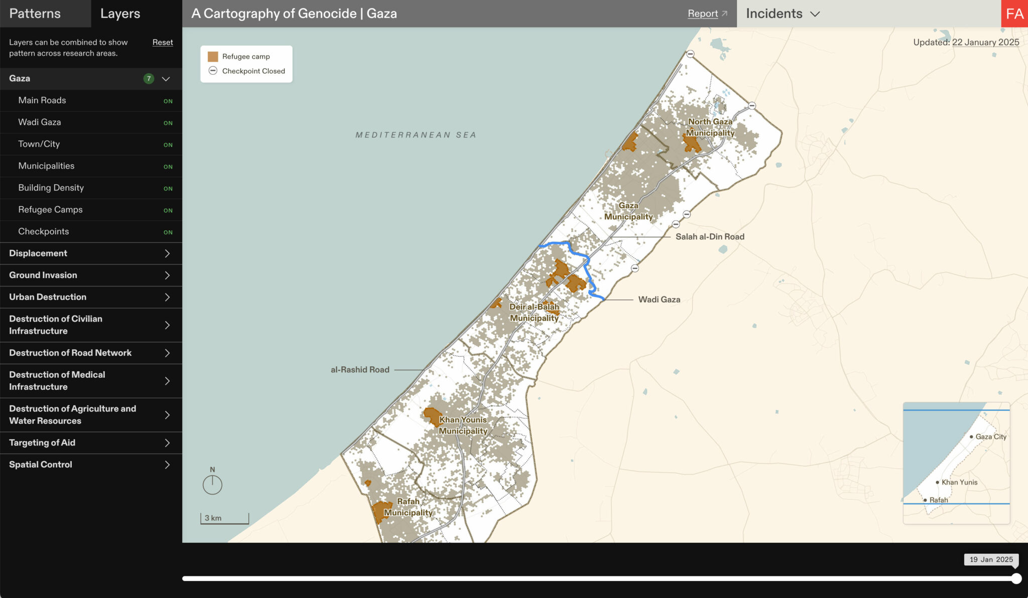 The platform compiles evidence of thousands of acts of violence and destruction committed by the Israeli military against all aspects of civilian life in Gaza.